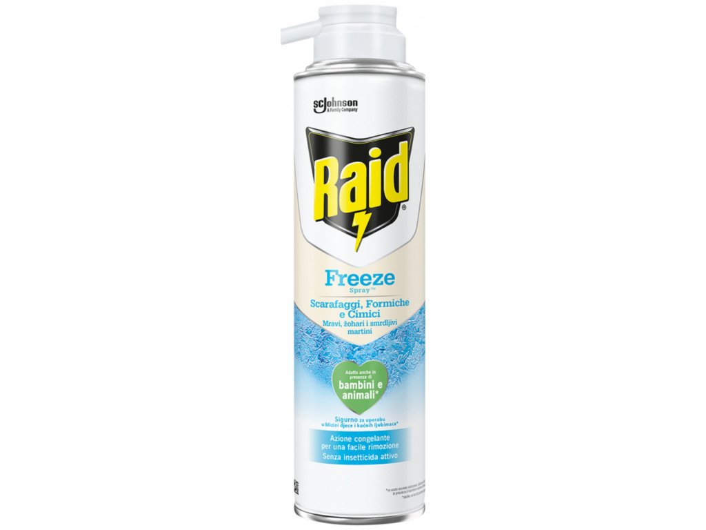 L'aérosol Raid Essentials Freeze Spray, sans biocides actifs, élimine les insectes par congélation en quelques secondes, facilitant ainsi leur élimination à l'extérieur. Il est efficace contre de nombreux types d'insectes tels que les fourmis, les blattes (Blattella germanica), les araignées et les punaises de lit. Il convient à une utilisation domestique en présence d'enfants et d'animaux domestiques (en suivant le mode d'emploi). Il ne laisse aucun résidu chimique ni odeur.