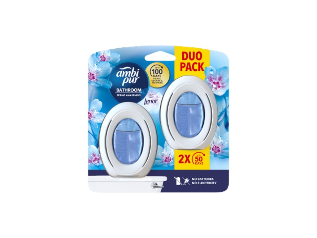 Diffuseur de parfum d'ambiance à base d'huiles essentielles. Ce diffuseur élimine les odeurs ambiantes et les empêche de se déposer sur les surfaces textiles comme les serviettes, la baignoire ou le rideau de douche. Grâce à sa technologie exclusive Odour Clear, il garantit une fraîcheur continue jusqu'à 45 jours. De plus, il fonctionne sans piles ni électricité. Embaumez votre salle de bain d'un parfum exceptionnel avec Ambi Pur Salle de bain. Lot de deux.