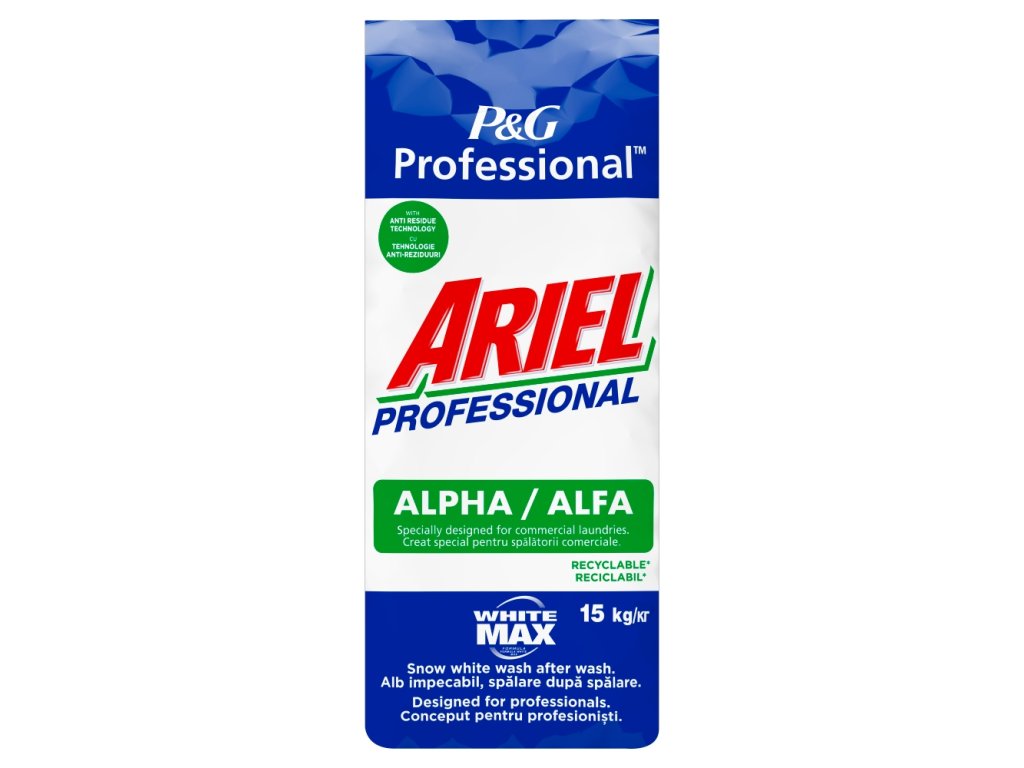 Lessive enzymatique en poudre universelle qui élimine efficacement les taches courantes. Elle est principalement destinée aux blanchisseries professionnelles. La nouvelle formule de la lessive pour linge blanc Ariel Alfa a été améliorée pour un lavage encore plus performant. Ariel Alfa contient 2,5 fois plus d'azurants optiques que la version précédente, ce qui ravive la blancheur et préserve l'éclat du linge plus longtemps. Elle maintient et améliore la blancheur d'origine même après 50 lavages (test indépendant réalisé par TZU Brno). Elle contient un polymère qui empêche la saleté de s'incruster dans le linge.