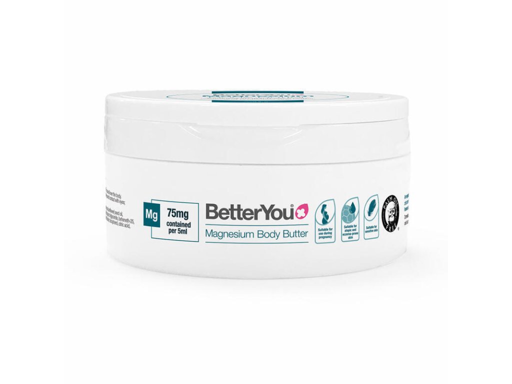Convient aux peaux sensibles. Ce beurre corporel riche et intensément hydratant contient un équilibre parfait de chlorure de magnésium et d'ingrédients doux pour la peau. Il laisse la peau incroyablement douce. 5 ml de beurre corporel apportent 75 mg de magnésium (21,5 % des AJR). Testé dermatologiquement et certifié pour les peaux atopiques. Idéal pour les peaux sèches, y compris celles sujettes à l'eczéma et au psoriasis. Emballage 100 % recyclable. Convient aux végétariens. Le chlorure de magnésium de qualité supérieure Zechstein BetterYou provient de la mer de Zechstein, source naturelle de magnésium en Europe, enfouie profondément dans la croûte continentale. Préservée de la pollution il y a plus de 250 millions d'années, la mer de Zechstein garantit la pureté et la qualité de son magnésium. Utilisation : Appliquez environ 5 ml sur peau propre et sèche et massez délicatement. Idéal après la douche ou le bain. Peut également être utilisé pendant la grossesse. Ingrédients : Aqua (eau), beurre de butyrospermum parkii (karité), huile de graines d'helianthus annuus (tournesol), chlorure de magnésium, glycérine, stéarate de glycéryle, cera alba (cire d'abeille), triglycéride caprylique/caprique, béhéneth-25, oxyde de zinc, phénoxyéthanol, polyuréthane-62, beurre de graines de theobroma cacao (cacao), tocophérol, acide citrique, éthylhexylglycérine, trideceth-6.Paramètres supplémentaires