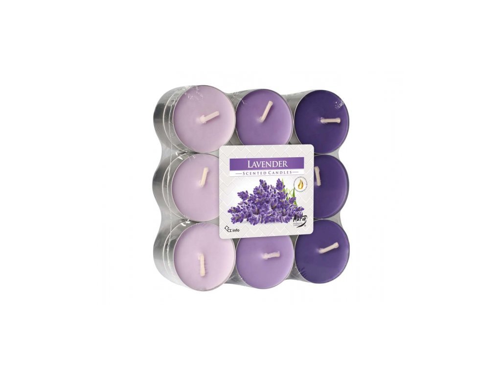 Bougies chauffe-plat parfumées à la lavande, déclinées en trois nuances de rose et de violet, présentées dans une coupelle en aluminium. Conditionnées par 18 (3 rangées de 3, sur 2 couches) dans un sachet plastique illustré de lavande en fleurs.