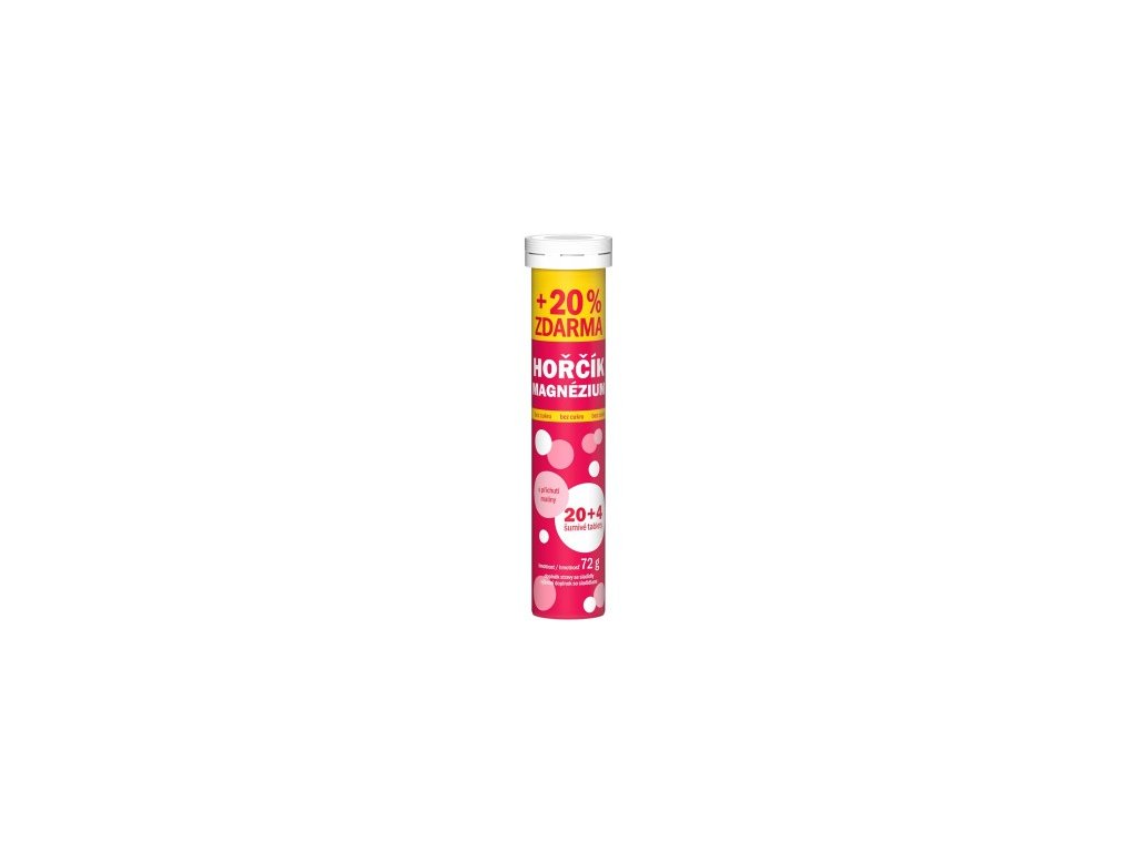 Complément alimentaire – comprimés effervescents à base de magnésium. Avec édulcorants. Sans sucre. Poids : 72 g. 20 + 4 comprimés (76 g).