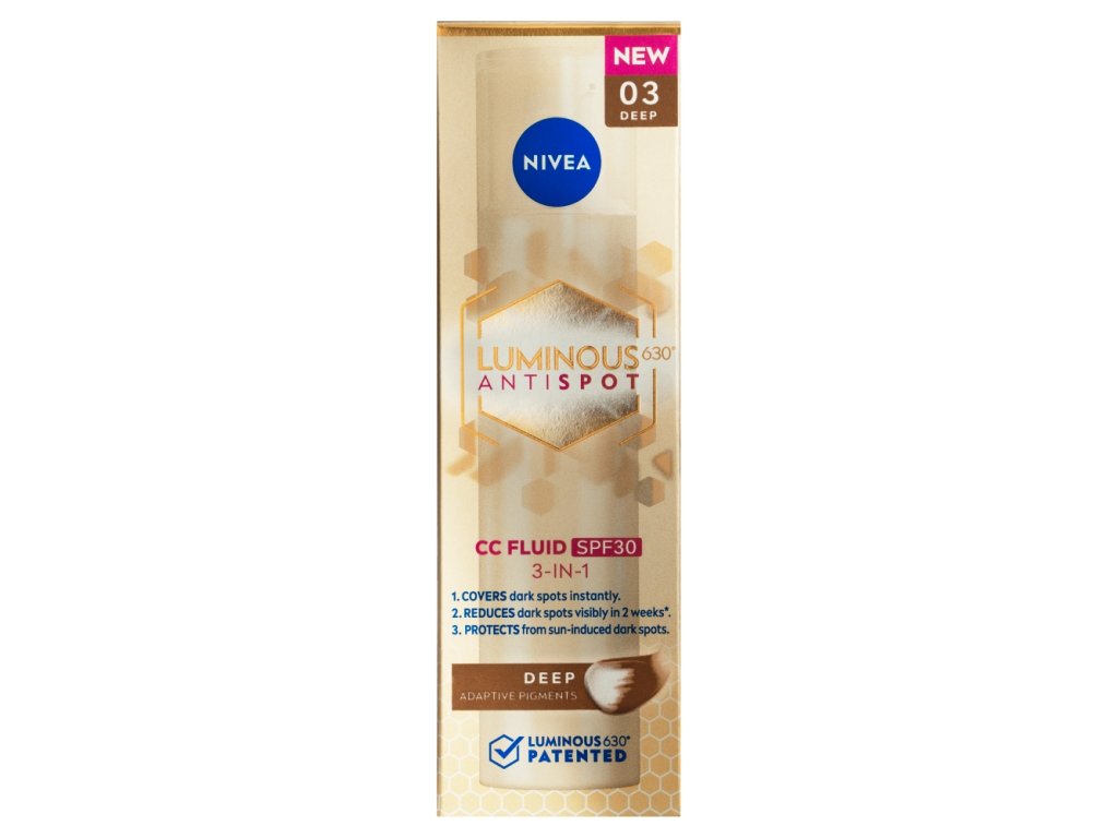 Un teint éclatant et naturellement uniforme au quotidien ? Essayez la CC Crème LUMINOUS630®. Grâce à son SPF 30, elle est idéale pour camoufler les imperfections et protéger votre peau des rayons UV. Sa formule brevetée LUMINOUS630® atténue les taches brunes et unifie le teint. Ses pigments s’adaptent à votre carnation et couvrent les taches pigmentaires ainsi que toutes les autres imperfections. Camouflez vos imperfections, protégez votre peau du soleil et estompez les taches pigmentaires en un seul geste. Essayez la CC Crème 3 en 1 NIVEA.