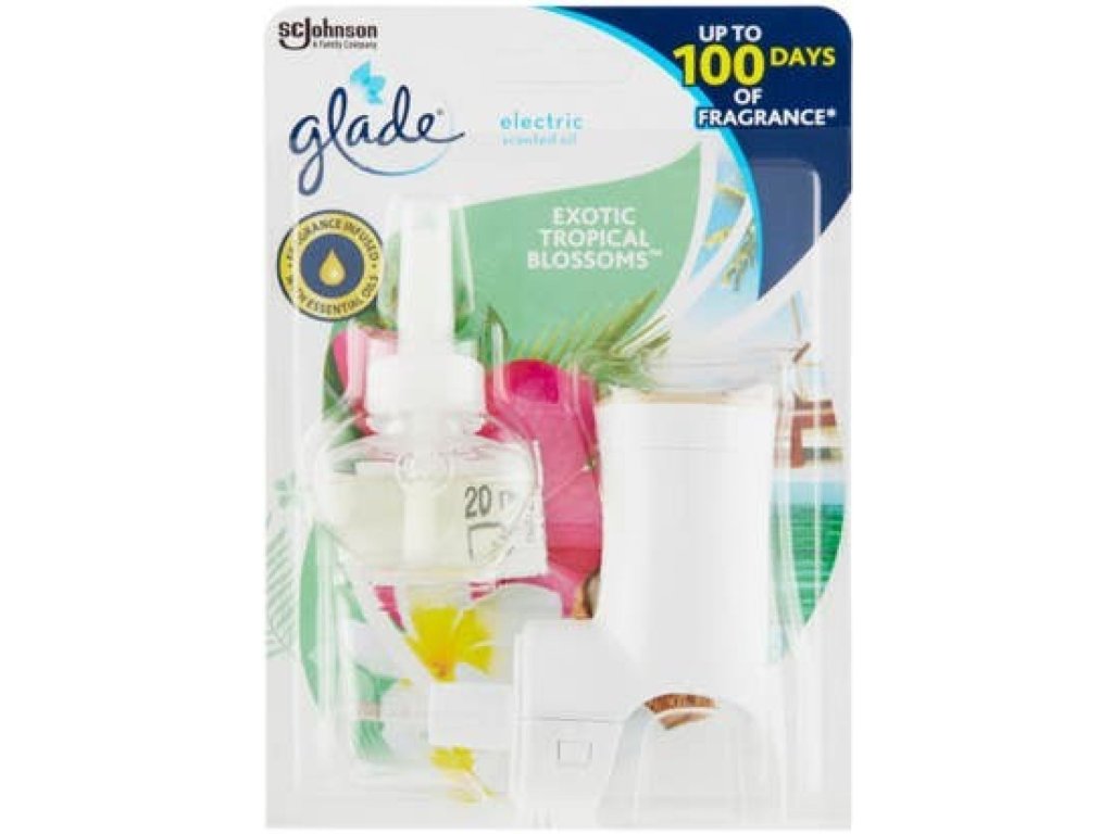 Diffuseur de parfum électrique Glade, parfum Fleurs Tropicales Exotiques, aux notes de fleurs de monoï et de lait de coco, avec réservoir de liquide de 20 ml.
