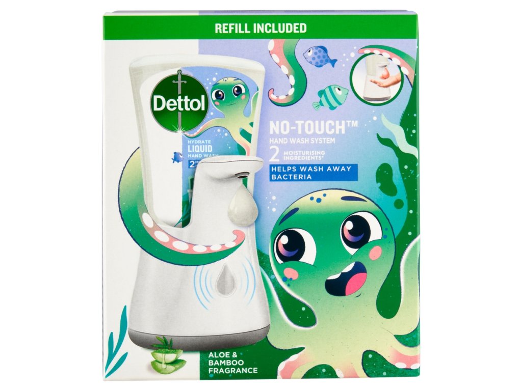 Distributeur de savon sans contact Dettol + recharge de savon liquide Dettol Kids Adventurer pour distributeur sans contact. Simple et pratique d'utilisation, le distributeur de savon sans contact Dettol aide vos enfants à se laver les mains. Il suffit de placer les mains directement sous le distributeur pour que la dose de savon idéale soit distribuée automatiquement. Le parfum agréable du savon transforme le lavage des mains en un véritable moment de plaisir pour les plus jeunes. Notre formule lave efficacement les mains tout en respectant la peau. Les autocollants inclus permettent de personnaliser le distributeur et offrent une activité ludique.