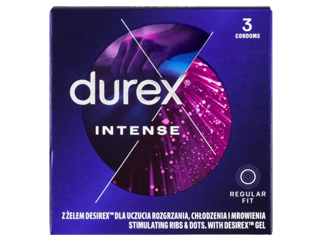 Préservatifs Durex Intense Orgasmic - crêtes et protubérances stimulantes, avec gel Desirex procurant une sensation de chaleur, de fraîcheur ou de picotement.
