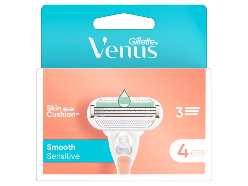 Les têtes de rechange Gillette Venus Sensitive Smooth sont équipées de trois lames tranchantes et d'une bande hydratante spéciale qui prend soin des peaux sensibles.