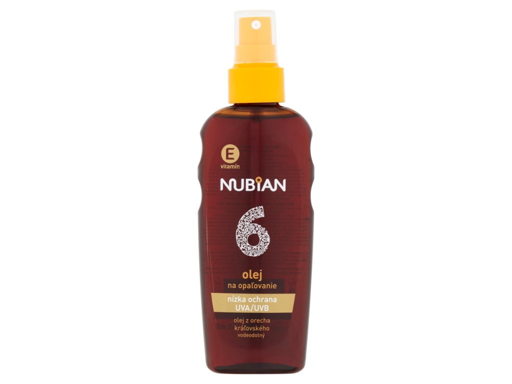 Protégez et nourrissez votre peau pendant votre bain de soleil et obtenez un teint hâlé grâce à l'huile bronzante waterproof Nubian SPF 6 en spray. Ses filtres UVA et UVB protègent efficacement la peau, l'huile de noix royale lui apporte les nutriments essentiels et la vitamine E régénère les cellules. L'application est rapide et facile. Vaporisez l'huile uniformément sur la peau sèche du corps et du visage 15 minutes avant l'exposition au soleil. Évitez le contour des yeux. Renouvelez l'application régulièrement au cours de la journée, surtout en cas de transpiration excessive ou après la baignade. Évitez l'exposition prolongée au soleil entre 11 h et 15 h et protégez-vous avec des vêtements, un chapeau et des lunettes de soleil. N'exposez pas les enfants de moins de trois ans au soleil. Une exposition excessive au soleil est dangereuse pour la santé. Aucune crème solaire n'offre une protection à 100 % contre les rayons du soleil. Les crèmes solaires peuvent laisser des traces sur les tissus et autres matériaux.