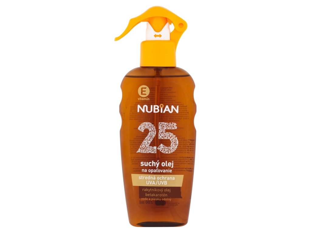 Huile solaire sèche Nubian, résistante à l'eau et au sable, SPF 25. Cette huile sèche est facile à appliquer et ne laisse pas de sensation grasse sur la peau.