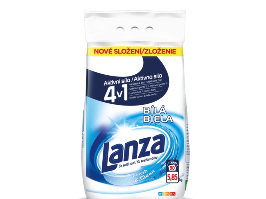 La nouvelle lessive Lanza Fresh & Clean White, grâce à sa composition, élimine efficacement les taches et la saleté de votre linge blanc et le laisse agréablement parfumé. Elle contribue également à prévenir le grisaillement du blanc, pour que vos vêtements restent comme neufs plus longtemps. Elle contient de la CMC (carboxyméthylcellulose), qui crée une couche protectrice sur le linge et empêche la décoloration et le dépôt de saletés. Grâce à sa formule améliorée, enrichie en agents actifs, vous utilisez moins de lessive pour un résultat impeccable. Lanza Fresh & Clean, pour un linge frais et propre jour après jour. 5,85 kg
