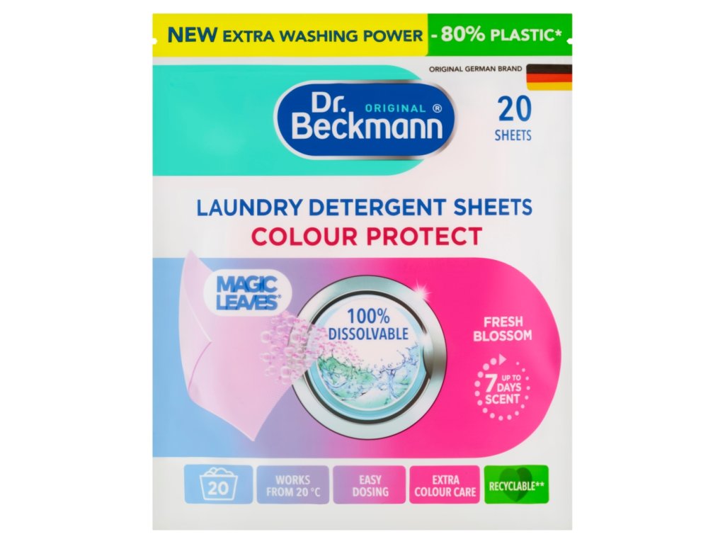 Les lingettes à lessive Dr. Beckmann Magic Leaves Fresh Blossom Color sont une lessive ultra-légère qui simplifie votre lessive. Une seule lingette soluble dans l'eau garantit un nettoyage en profondeur et des couleurs éclatantes, même à basse température.