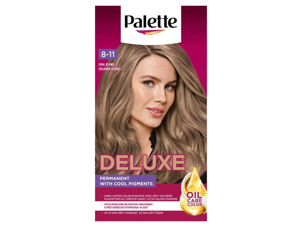 La coloration Palette Deluxe, enrichie en micro-huiles, pénètre au cœur de la fibre capillaire et y fixe ses pigments froids. Elle couvre parfaitement les cheveux blancs et sa couleur tient jusqu'à 6 semaines. Associée à des huiles naturelles, elle nourrit intensément vos cheveux et leur apporte une brillance éclatante. Immédiatement après la coloration, il est recommandé d'appliquer le masque inclus dans la boîte Palette Deluxe pour un soin optimal. Pour conserver la brillance soyeuse de vos cheveux, appliquez une seconde dose de masque 3 semaines après la coloration.