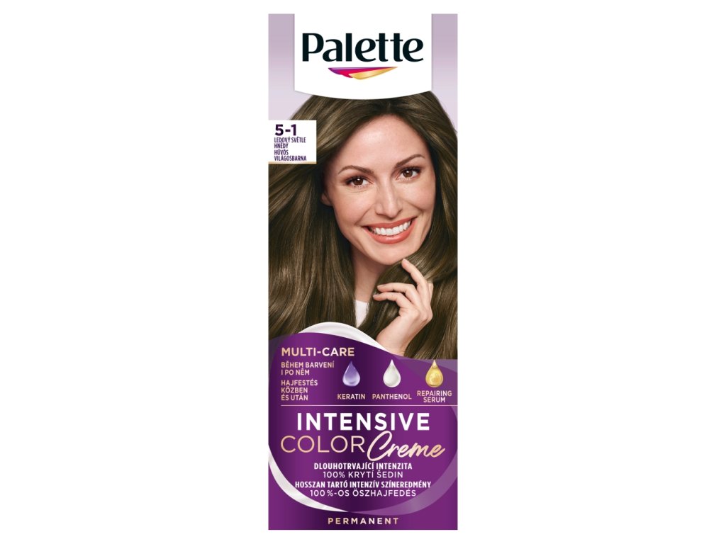 Découvrez Palette Intensive Color Crème à la formule MULTI-SOIN pour une couleur intense et durable. Sa formule hautement concentrée en pigments pénètre au cœur de la fibre capillaire et fixe la couleur pour la protéger de la décoloration. Résultat : une couleur éclatante qui dure plusieurs semaines et une couverture à 100 % des cheveux blancs. La nouvelle formule MULTI-SOIN, enrichie en kératine, panthénol et sérum régénérant, protège vos cheveux et leur apporte un soin complet pendant et après la coloration. La kératine forme un film protecteur qui préserve la fibre capillaire. Le panthénol nourrit intensément les cheveux et améliore visiblement leur qualité. Le sérum régénérant est conçu pour réparer et adoucir la fibre capillaire. Cette nuance convient aux cheveux châtains clairs à foncés, ainsi qu’aux cheveux entièrement blancs.