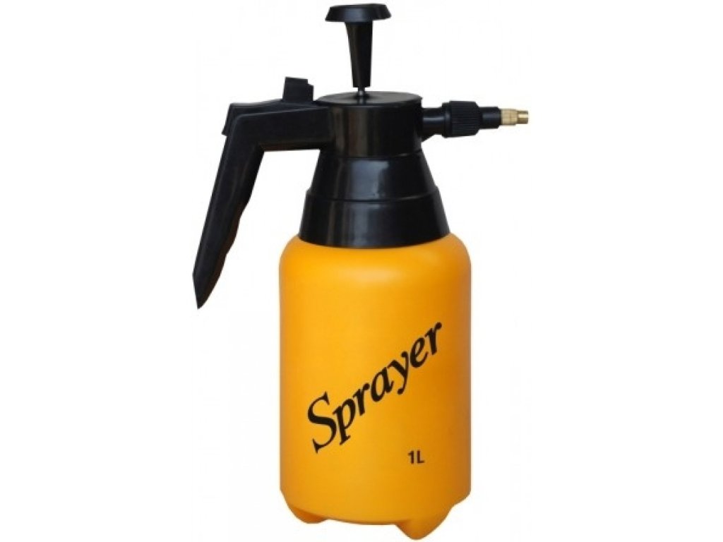 Pulvérisateur en plastique. Le réservoir de liquide est cylindrique et jaune, d'un diamètre de 13,5 cm. La poignée et le bec verseur sont noirs. Le pulvérisateur est muni d'un embout métallique. Ce pulvérisateur a une capacité de 1,5 l et mesure 32 cm de haut et 18 cm de large. Ce pulvérisateur a une capacité de 2 l et mesure 67 x 41 x 34,5 cm. Ce pulvérisateur a une capacité de 1 l et mesure 30,5 cm de haut, 18 cm de large et 10 cm de profondeur.