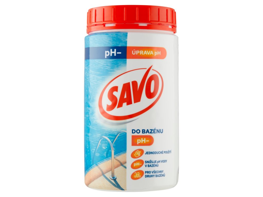- Savo pH- est conçu pour réduire le pH de l'eau des piscines. La plage de pH idéale pour l'eau des piscines se situe entre 7,1 et 7,5.