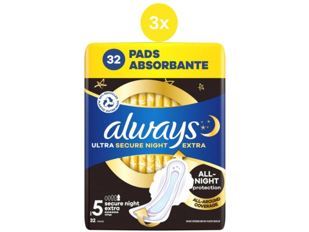 Serviettes hygiéniques Always Ultra Extra Secure Nuit, paquet de 32.