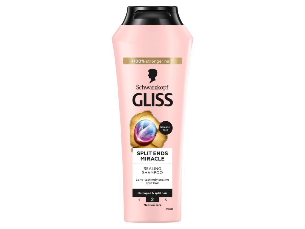 Shampoing Gliss Split Ends Miracle avec complexe ionique et huile de pépins de raisin pour cheveux abîmés et pointes fourchues. Régénère et nettoie les cheveux.