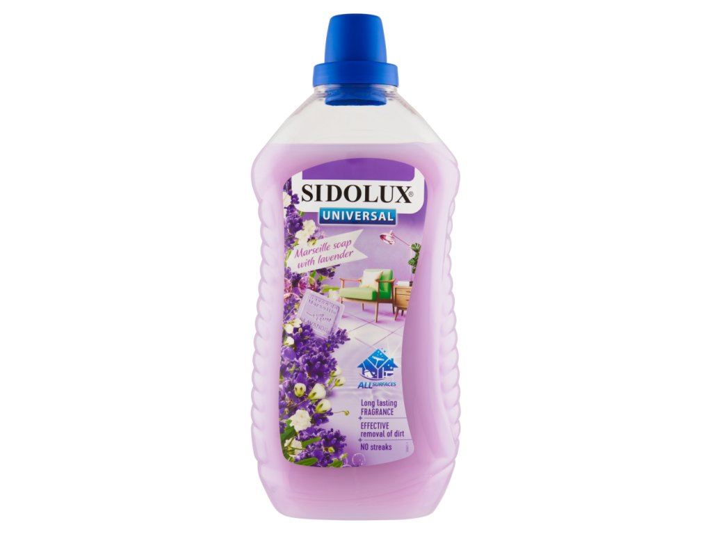 SIDOLUX UNIVERSAL SODA POWER Ce nettoyant universel allie l'efficacité et le parfum exceptionnel du savon de Marseille et de la lavande. Grâce à son système unique Soda Power qui adoucit l'eau, il élimine rapidement la saleté des surfaces. Il nettoie facilement toutes les surfaces lavables, sans laisser de traces et sans frotter. Vous pouvez l'utiliser en toute confiance pour laver les sols, les rebords de fenêtres, les plateaux de table, les pots de fleurs, etc.
