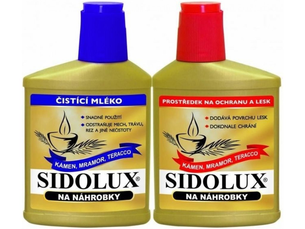 SIDOLUX pour l'entretien des pierres tombales (nettoyant + vernis protecteur) 330 g + 250 ml est un ensemble complet de produits pour le nettoyage et la protection des pierres tombales en matériaux naturels poreux non polis. Le lait nettoyant convient au nettoyage de toutes les surfaces, même polies, tandis que le vernis protecteur est exclusivement destiné aux surfaces poreuses non polies.